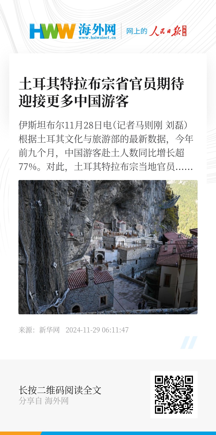 新华网伊斯坦布尔11月28日电(记者马则刚 刘磊)根据土耳其文化与旅游部的最新数据,今年前九个月,中国游客赴土人数同比增长超77%。对此,土耳其特拉布宗当地官员及旅游部门负责人日前表示,期待更多中国游客探索特拉布宗,体验其丰富的文化遗产与民俗传统。