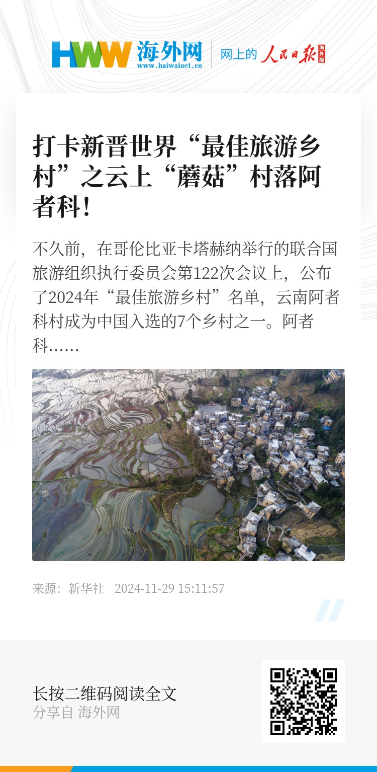 不久前,在哥伦比亚卡塔赫纳举行的联合国旅游组织执行委员会第122次会议上,公布了2024年“最佳旅游乡村”名单,云南阿者科村成为中国入选的7个乡村之一。