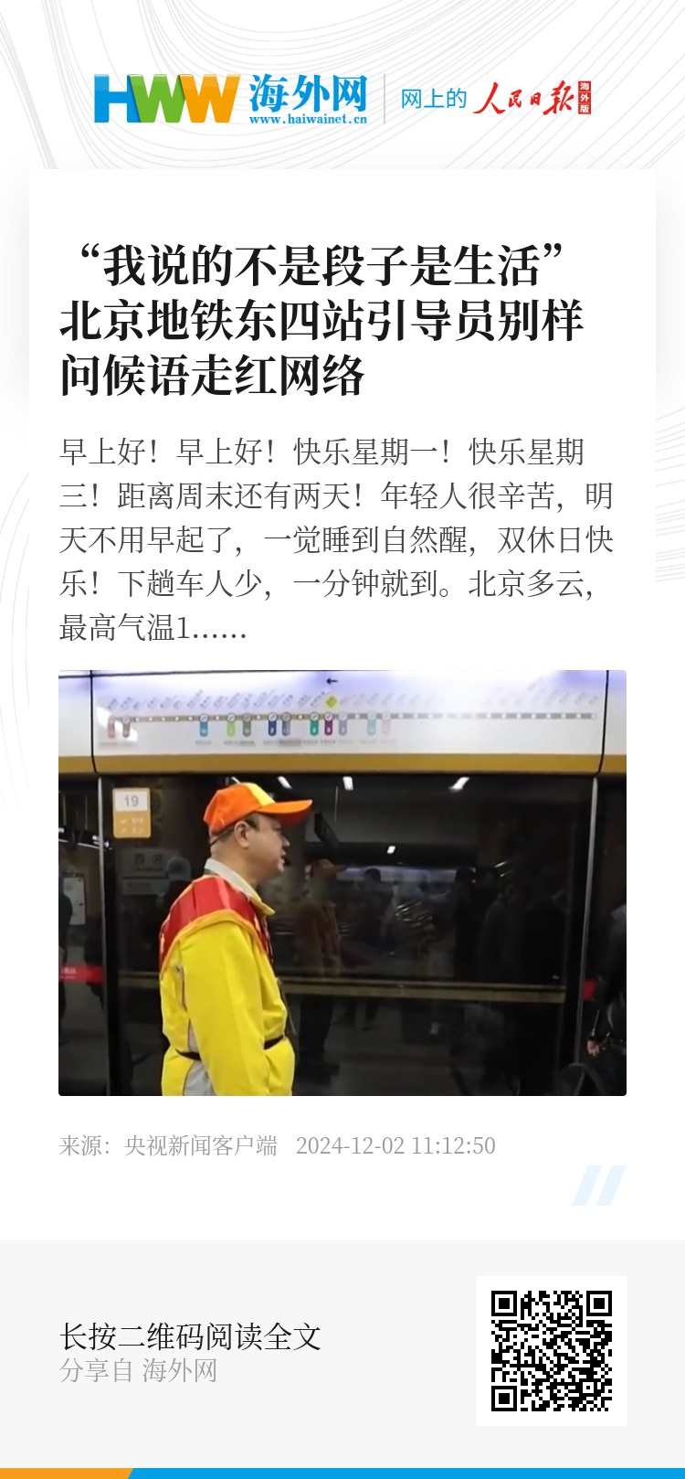 北京地铁引导员 别样问候语走红网络