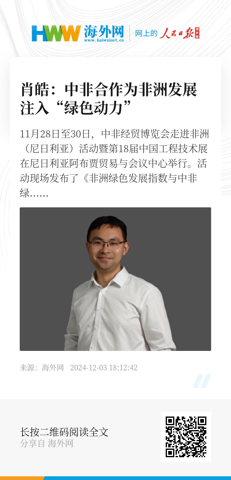 11月28日至30日,中非经贸博览会走进非洲(尼日利亚)活动暨第18届中国工程技术展在尼日利亚阿布贾贸易与会议中心举行。活动现场发布了《非洲绿色发展指数与中非绿色发展合作(2024)》报告,作为报告的牵头人,湖南大学经济与贸易学院副院长、中非经贸研究院执行秘书长肖皓在接受人民日报海外网记者采访时表示,在全球绿色转型的大背景下,中非绿色合作对于助推非洲绿色发展、经济社会发展转型具有重要意义。