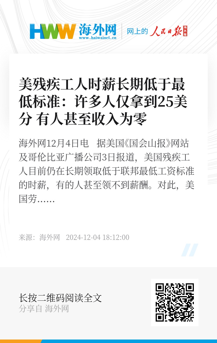 报道说,美国自大萧条时期起实施这项制度,美国劳工部可依法向雇主颁发许可证,允许雇主以残疾工人妨碍生产力为由,向残疾工人支付低于联邦最低工资标准的工资。目前,许多残疾人仍在所谓的庇护工场工作,这些工场由经过美国劳工部认证的雇主经营,工人时薪仅为25美分(约合人民币1.8元)。美劳工部助理部长威廉姆斯也表示,许多人收入不到最低标准(7.25美元/小时,约合人民币52.7元)的一半,有些人甚至收入为零。