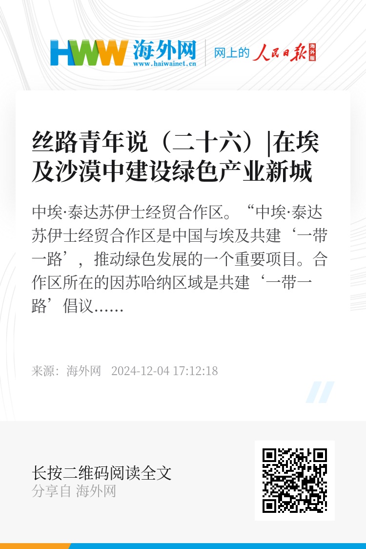 中埃·泰达苏伊士经贸合作区。“中埃·泰达苏伊士经贸合作区是中国与埃及共建‘一带一路’,推动绿色发展的一个重要项目。合作区所在的因苏哈纳区域是共建‘一带一路’倡议与埃及苏伊士运河走廊开发计划的交汇处,有着巨大的发展潜力。”埃及泰达投资公司执行董事徐琪峰说。中国互联网发展基金会中国正能量网络传播专项基金资助支持 中非泰达投资股份有限公司供图 海外网 张子旭/文