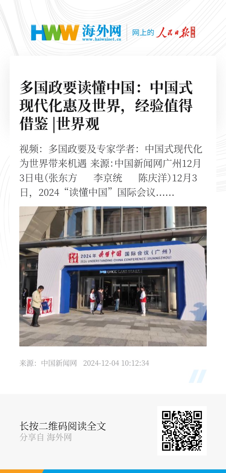 他表示,中国式现代化不仅关注自身的发展,更为世界发展提供了新机遇,为许多发展中国家提供了借鉴经验。