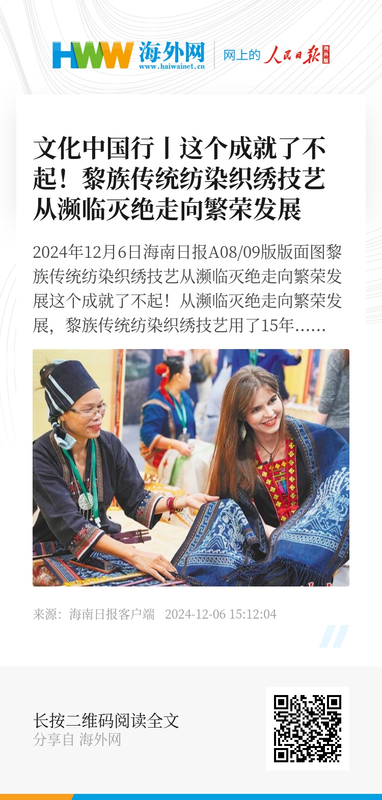 如今,黎族传统纺染织绣技艺传承人已从不足1000人增加到2万多人,36家黎锦企业、工坊、非遗传承人工作室组成了黎锦产业联盟,产品远销海内外,黎锦产品的市场接受度和竞争力不断提升;连续四年举办的“海南锦绣世界文化周”,吸引了全国相关行业和文旅单位的广泛参与;2024年9月,黎锦走进巴黎时装周的秀场,受到国际时尚界的关注……黎锦正在成为海南最具魅力的文化名片之一。