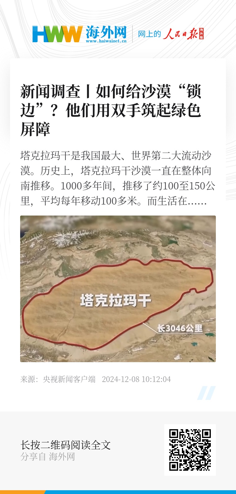2023年6月,习近平总书记在内蒙古巴彦淖尔市主持召开加强荒漠化综合防治和推进“三北”等重点生态工程建设座谈会,强调要打好河西走廊——塔克拉玛干沙漠边缘阻击战等三大战役。3046公里,是环绕塔克拉玛干沙漠一圈的长度。过去40多年,依托“三北”防护林体系工程建设,塔克拉玛干沙漠周边已形成长达2761公里的绿色阻沙防护带。截至2023年底,还剩285公里的空白区。塔克拉玛干沙漠边缘阻击战的首要任务,就是要补齐缺口,给沙漠“锁边”。