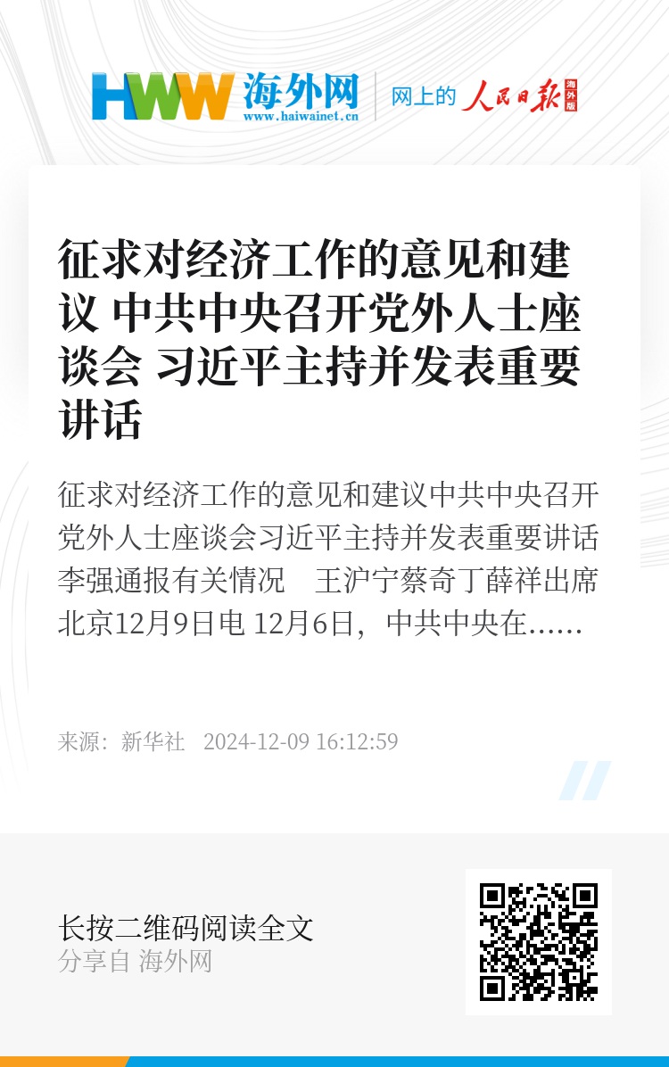新华社北京12月9日电 12月6日,中共中央在中南海召开党外人士座谈会,就今年经济形势和明年经济工作听取各民主党派中央、全国工商联负责人和无党派人士代表的意见和建议。中共中央总书记习近平主持座谈会并发表重要讲话强调,明年是“十四五”规划收官之年,要以新时代中国特色社会主义思想为指导,全面贯彻落实中共二十大和二十届二中、三中全会精神,坚持稳中求进工作总基调,完整准确全面贯彻新发展理念,加快构建新发展格局,扎实推动高质量发展,进一步全面深化改革,扩大高水平对外开放,建设现代化产业体系,更好统筹发展和安全,实施更加积极有为的宏观政策,扩大国内需求,推动科技创新和产业创新融合发展,稳住楼市股市,防范化解重点领域风险和外部冲击,稳定预期、激发活力,推动经济持续回升向好,不断提高人民生活水平,保持社会和谐稳定,高质量完成“十四五”规划目标任务,为实现“十五五”良好开局打牢基础。