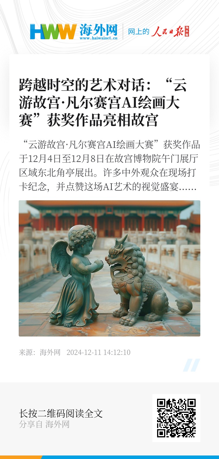 2024年是中法建交60周年暨中法文化旅游年。人民日报海外版与故宫博物院共同主办的“云游故宫·凡尔赛宫”AI绘画大赛,以“交流互鉴 共绘未来”为主题,于今年4月启动,共收到来自五大洲的近4000件作品,经网络投票、专家评审,产生38幅获奖作品。