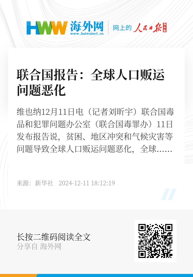 新华社维也纳12月11日电(记者刘昕宇)联合国毒品和犯罪问题办公室(联合国毒罪办)11日发布报告说,贫困、地区冲突和气候灾害等问题导致全球人口贩运问题恶化,全球儿童贩运和以强迫劳动、强迫犯罪为目的的人口贩运现象显著增加。