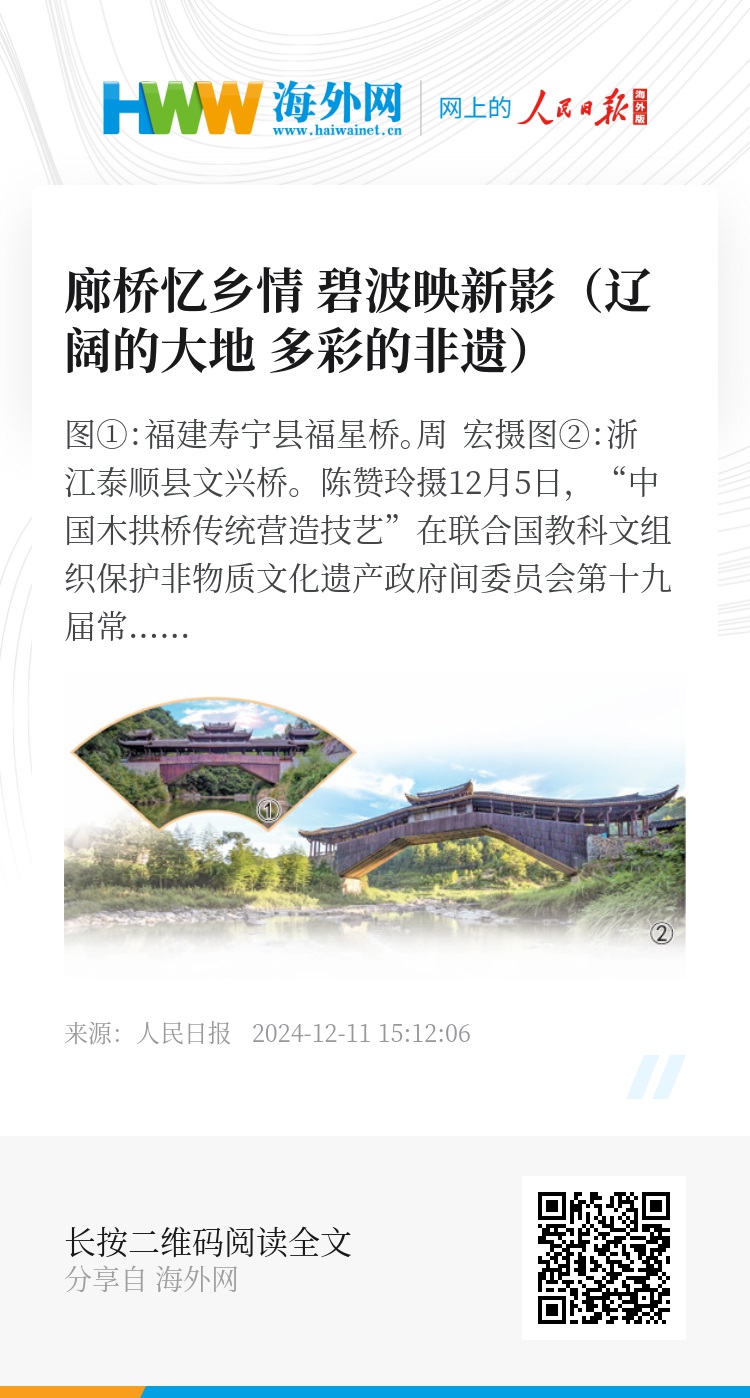 木拱桥传统营造技艺主要分布于福建省东北部和浙江省西南部。木拱桥既是传统的交通设施,也是当地居民进行情感交流、开展民俗活动的重要场所,凝结着深厚的文化和建筑艺术。转名录的背后,是非遗技艺传承的持续加强,这离不开政策的扶持、社会的关注,也离不开一代代工匠的付出。如今,福建和浙江多地不仅精心保护古廊桥,还在需要的地方修建新廊桥,古老的非遗技艺融入当代生活。
