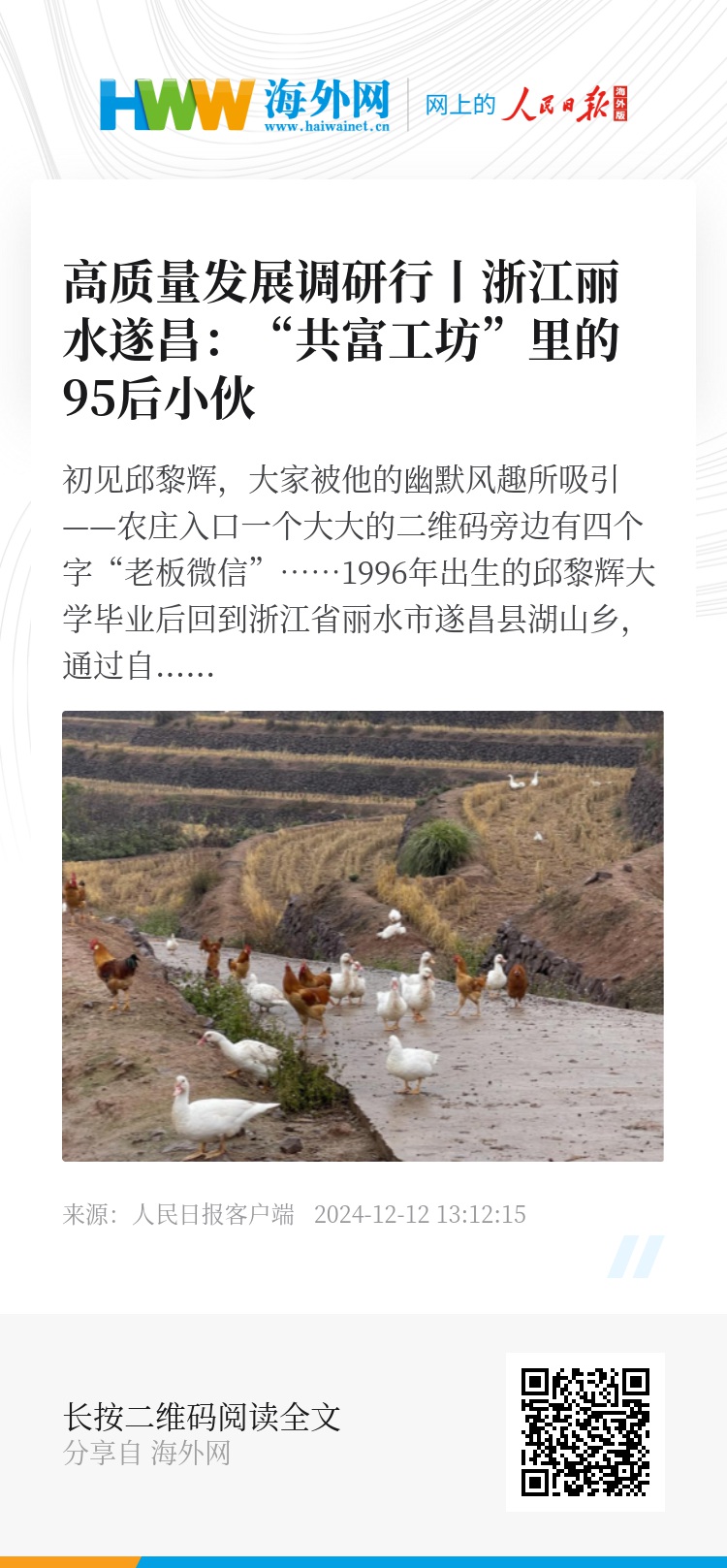 1996年出生的邱黎辉大学毕业后回到浙江省丽水市遂昌县湖山乡,通过自己的努力,想为这片乡土带来新的发展机遇。
