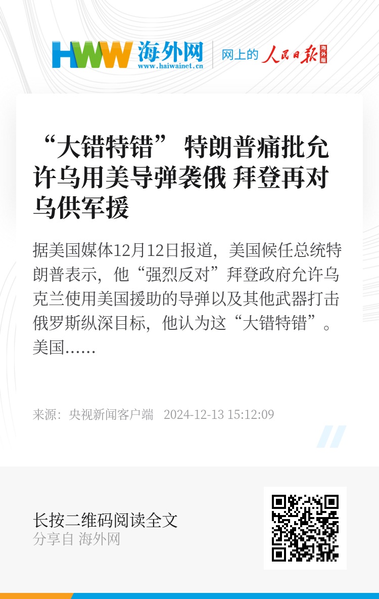 据美国媒体12月12日报道,美国候任总统特朗普表示,他“强烈反对”拜登政府允许乌克兰使用美国援助的导弹以及其他武器打击俄罗斯纵深目标,他认为这“大错特错”。美国12日宣布向乌克兰提供价值5亿美元的额外军事援助,并表示将持续向乌方提供武器,直至本届政府任期届满为止。