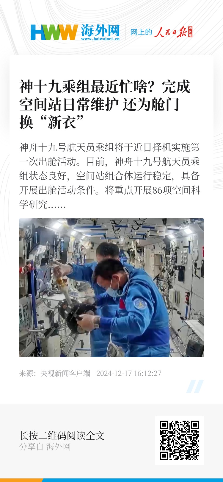 完成空间站日常维护 为舱门换“新衣”