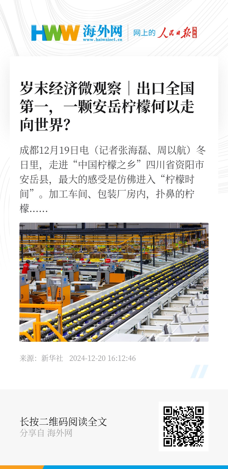 新华社成都12月19日电(记者张海磊、周以航)冬日里,走进“中国柠檬之乡”四川省资阳市安岳县,最大的感受是仿佛进入“柠檬时间”。加工车间、包装厂房内,扑鼻的柠檬清香将人包围,流水线上金黄色的果子滚动着,一车车打包好的柠檬从这里启程,发往菲律宾、泰国、越南等30多个国家和地区。