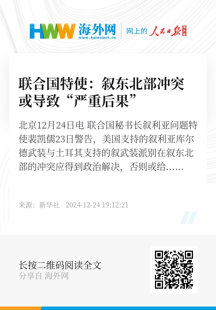 新华社北京12月24日电 联合国秘书长叙利亚问题特使裴凯儒23日警告,美国支持的叙利亚库尔德武装与土耳其支持的叙武装派别在叙东北部的冲突应得到政治解决,否则或给叙利亚全境带来“严重后果”。
