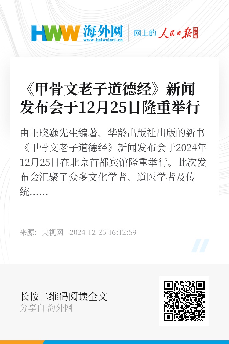 由王晓巍先生编著、华龄出版社出版的新书《甲骨文老子道德经》新闻发布会于2024年12月25日在北京首都宾馆隆重举行。此次发布会汇聚了众多文化学者、道医学者及传统文化爱好者。华龄出版社董巍副社长与作者王晓巍先生在发布会上共同为新书揭幕,特邀嘉宾有国际道教协会会长黄世真道长、北京神阙中医发展基金会理事长安丽萍女士、英国皇家医学院终身院士何月蓉女士、知行正道中医药集团创始人刘则安先生、中国科学技术信息研究所张超中研究员、记忆(北京)信息科学研究院姬广星院长、中国道家养生会何丰源理事、老子道学文化研究会常务理事王彤江博士等,共同见证了这部融合了古老智慧与甲骨文书法艺术的杰作问世。