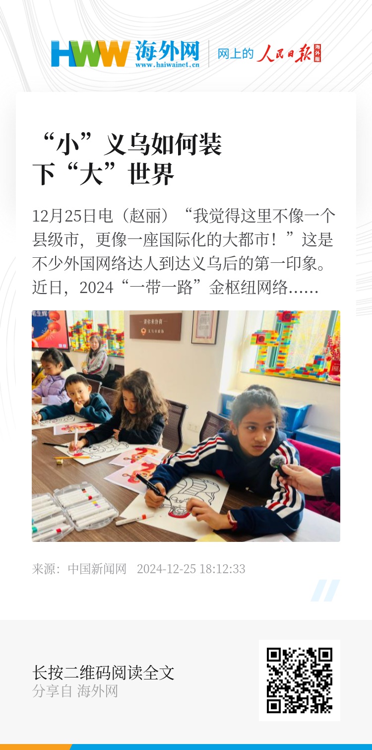 中新网12月25日电(赵丽)“我觉得这里不像一个县级市,更像一座国际化的大都市!”这是不少外国网络达人到达义乌后的第一印象。近日,2024“一带一路”金枢纽网络国际传播活动媒体采风团走进义乌,感受这座“国际范儿”的城市抢抓世界商机、完善国际化社区治理的生动实践。