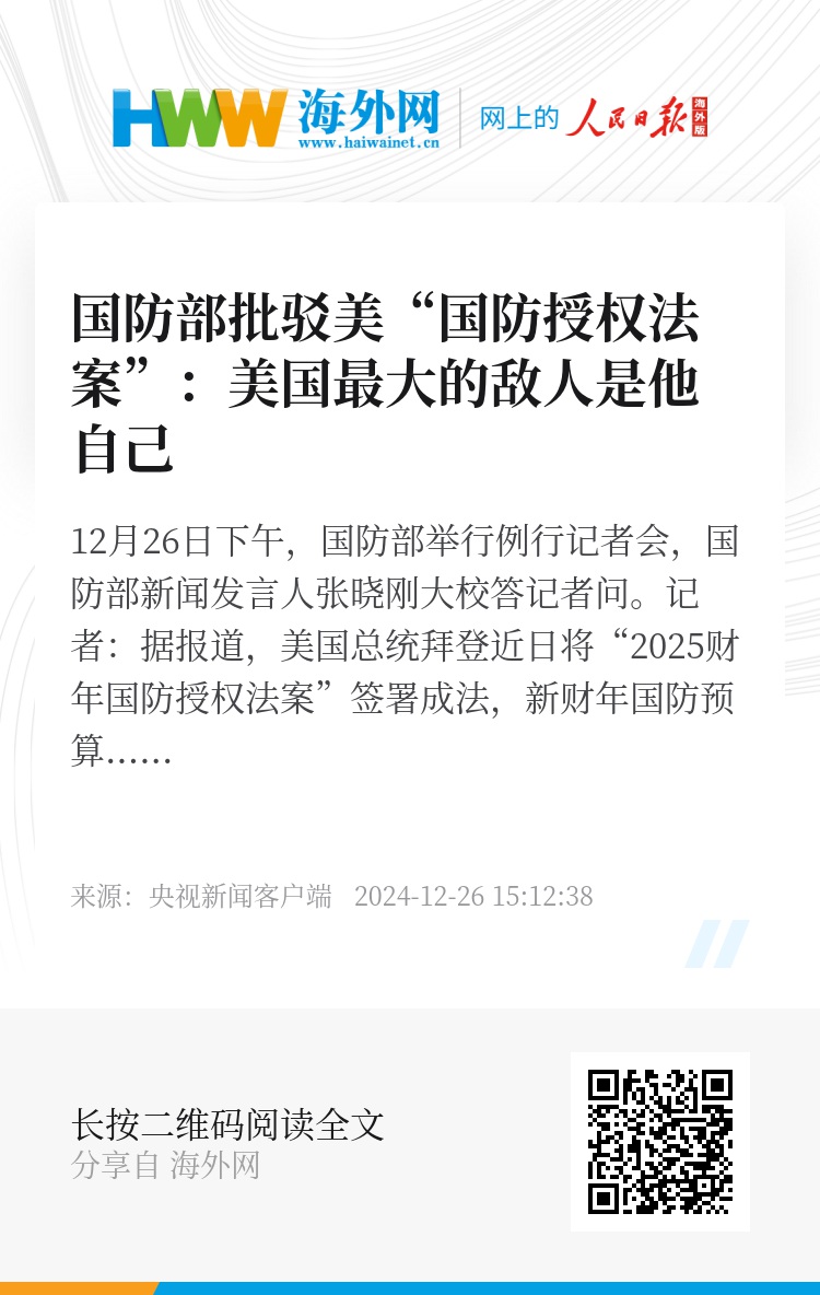 记者:据报道,美国总统拜登近日将“2025财年国防授权法案”签署成法,新财年国防预算高达8952亿美元,把中国视为主要国家安全挑战之一。有分析认为,这份法案的出台,反映了美国对自身实力的深度焦虑。请问发言人对此有何评价?中方是否会跟进大幅提升国防支出?