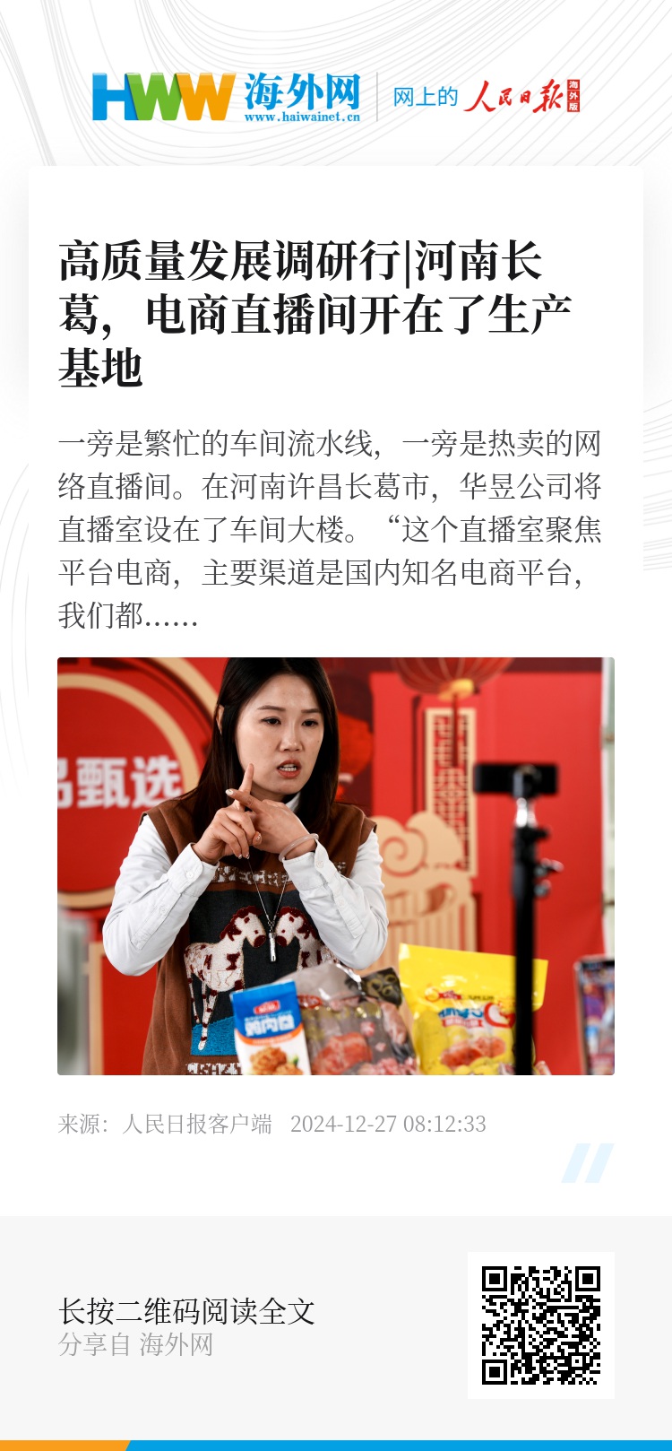 一旁是繁忙的车间流水线,一旁是热卖的网络直播间。在河南许昌长葛市,华昱公司将直播室设在了车间大楼。