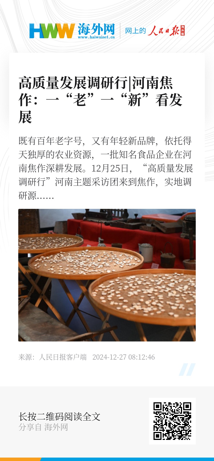 既有百年老字号,又有年轻新品牌,依托得天独厚的农业资源,一批知名食品企业在河南焦作深耕发展。12月25日,“高质量发展调研行”河南主题采访团来到焦作,实地调研源自百年品牌的怀山堂生物科技股份有限公司(以下简称“怀山堂”)和新式茶饮供应企业大咖国际食品有限公司(以下简称“大咖”)。走访这一“老”一“新”,得以一窥焦作市食品产业的发展。