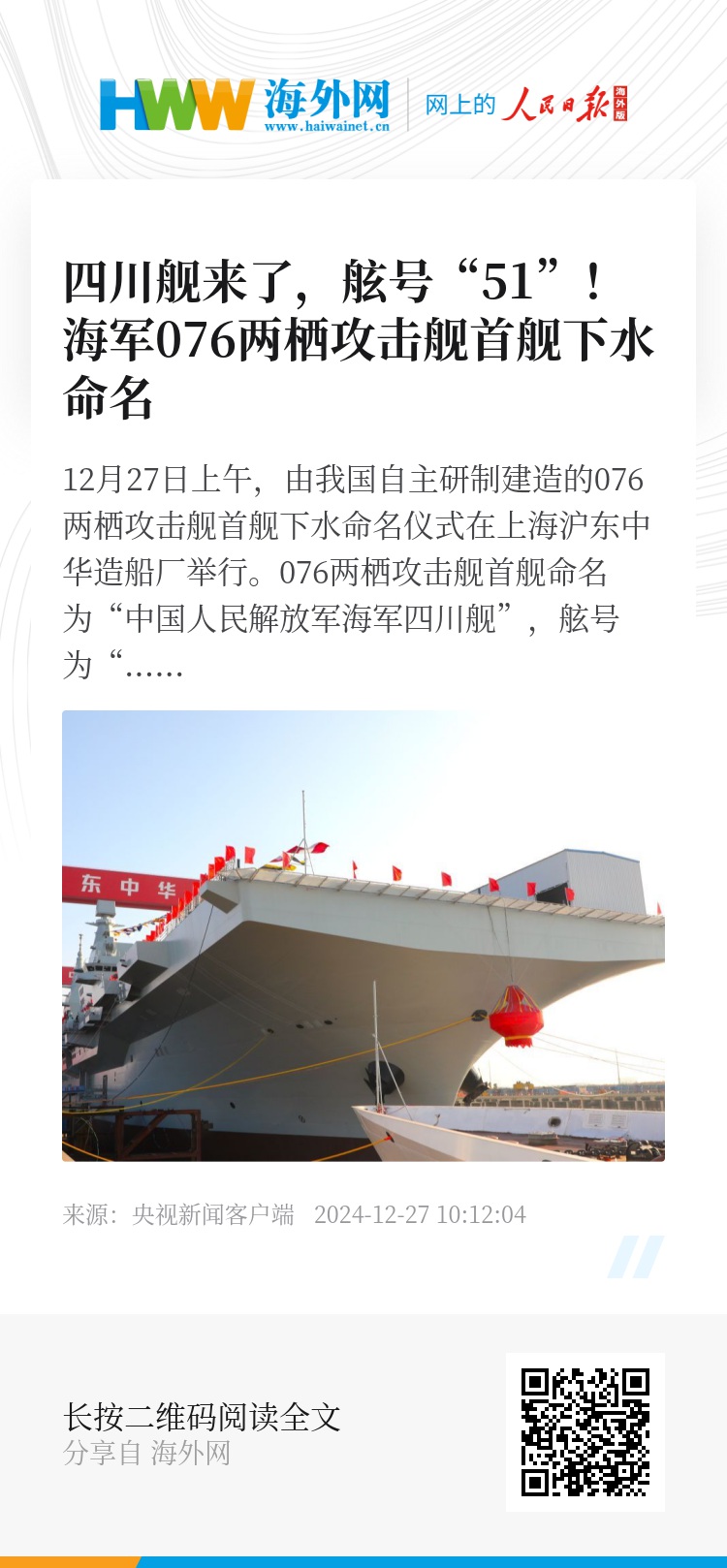 12月27日上午,由我国自主研制建造的076两栖攻击舰首舰下水命名仪式在上海沪东中华造船厂举行。