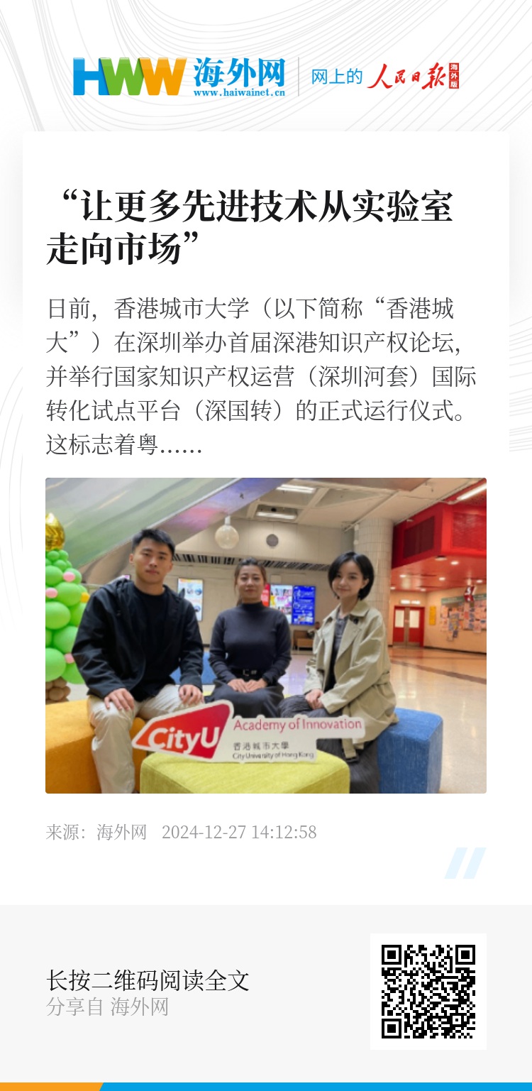 日前,香港城市大学(以下简称“香港城大”)在深圳举办首届深港知识产权论坛,并举行国家知识产权运营(深圳河套)国际转化试点平台(深国转)的正式运行仪式。这标志着粤港澳大湾区的建设推动,深港之间在科技方面的融合协作更进一步。