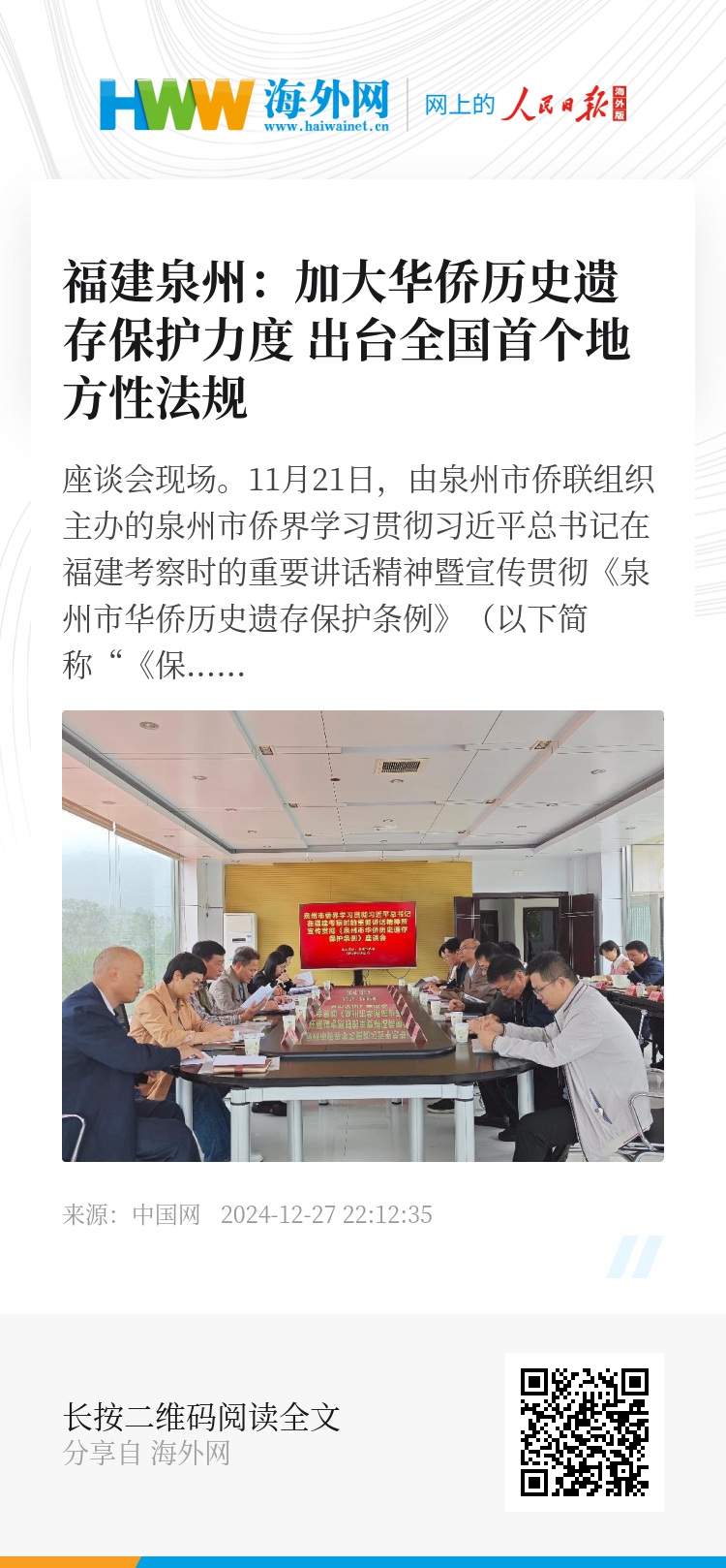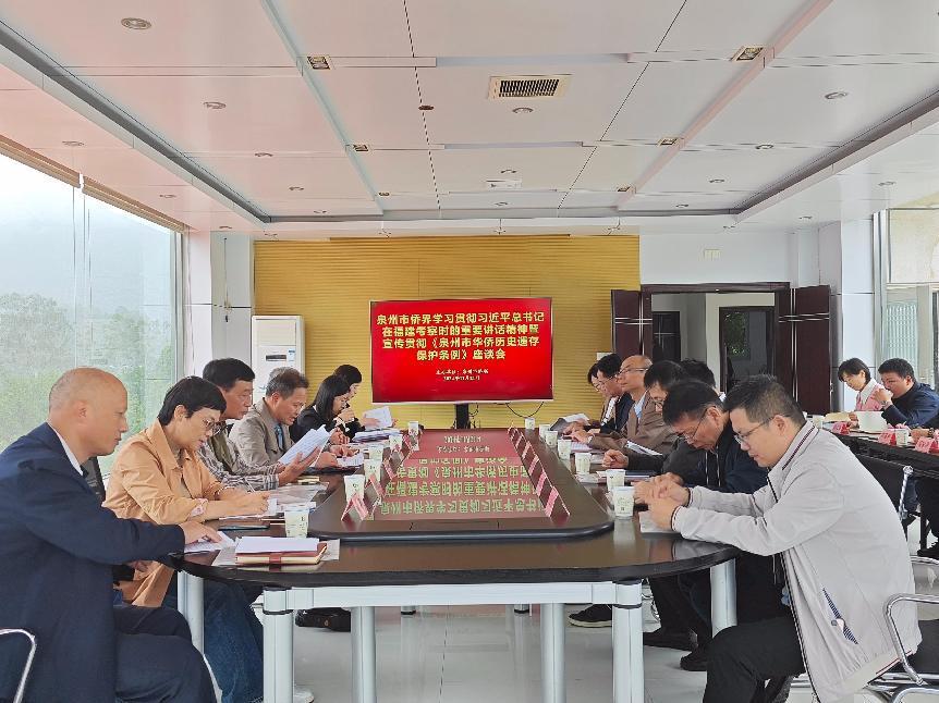 11月21日,由泉州市侨联组织主办的泉州市侨界学习贯彻习近平总书记在福建考察时的重要讲话精神暨宣传贯彻《泉州市华侨历史遗存保护条例》(以下简称“《保护条例》”)座谈会在南安市梅山镇召开。作为自9月26日福建省人大常委会第十二次会议决议通过《泉州市华侨历史遗存保护条例》以来召开的首次座谈会,会议邀请了泉州市人大法工委副主任施昀就《保护条例》进行详细解读。会上,来自泉州市“五侨”部门、泉州市中级人民法院、泉州市人民检察院、部分县(市、区)法院,南安市侨联,泉州市、南安市侨联法顾委、基层侨联工作代表围绕《保护条例》的贯彻实施等进行交流探讨。