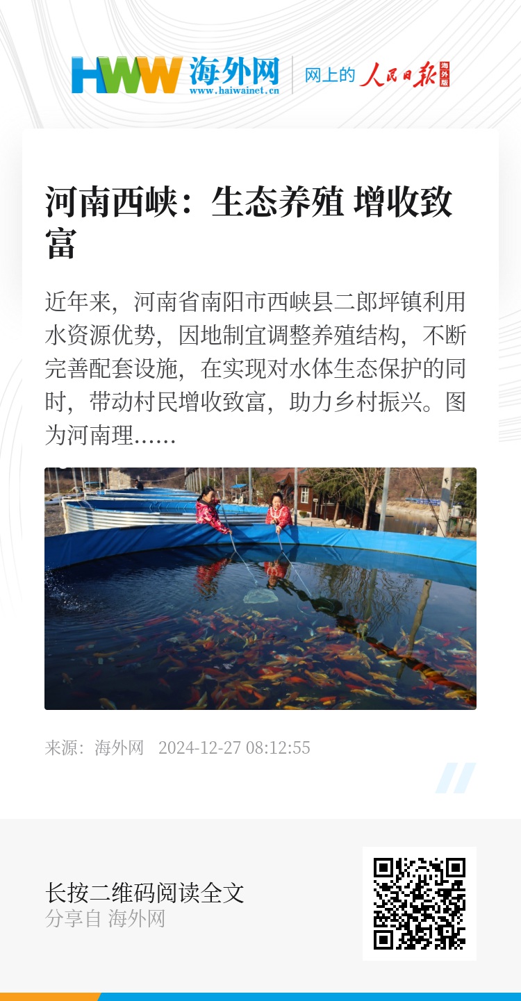 近年来,河南省南阳市西峡县二郎坪镇利用水资源优势,因地制宜调整养殖结构,不断完善配套设施,在实现对水体生态保护的同时,带动村民增收致富,助力乡村振兴。图为河南理想水产科技有限责任公司员工正在管护锦鲤,以供应节日市场。图源:东方IC