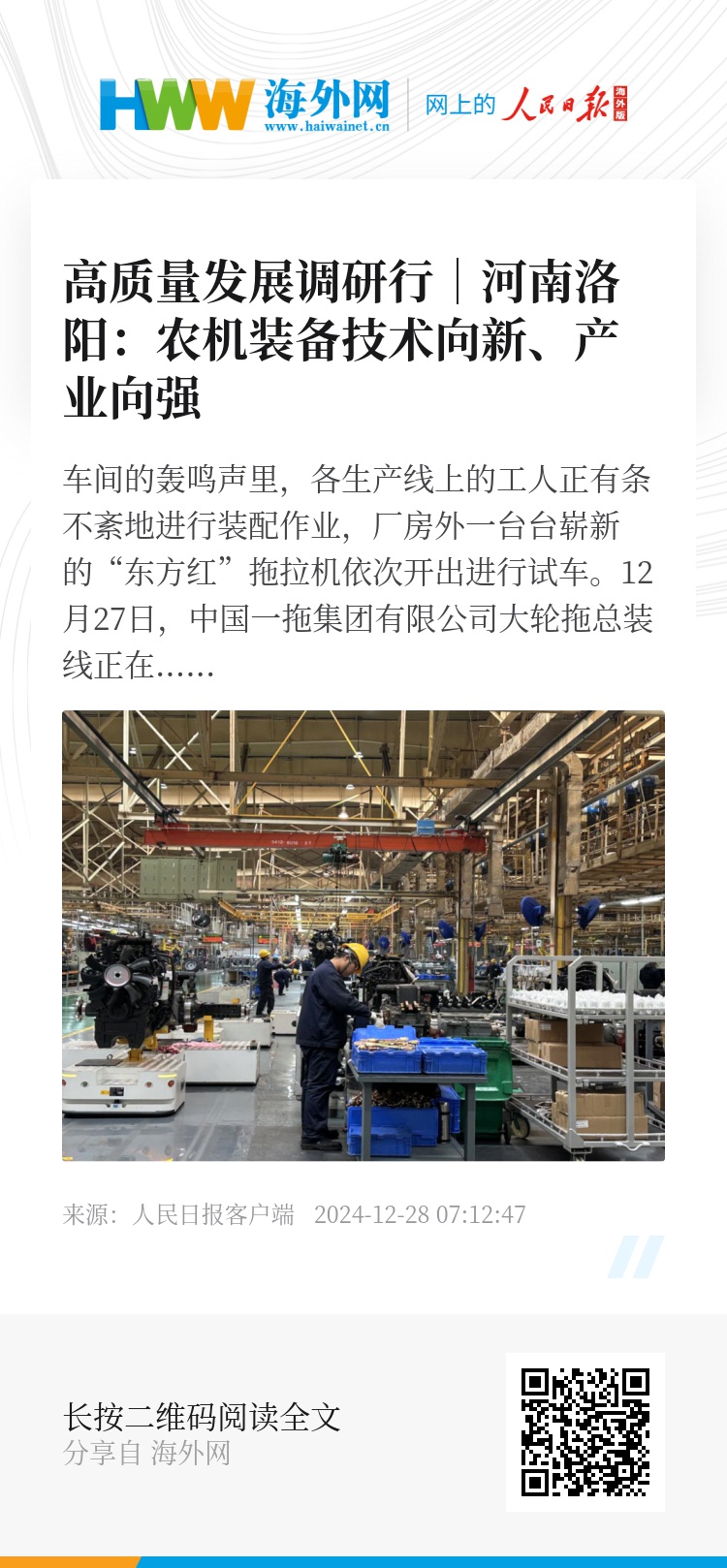 农业现代化关键在科技进步和创新,今年40岁的一线工人高斌对此有很深的感受。“我已经在一拖集团工作21年。刚进厂时,农机装备只有120马力,而现在已经达到了450马力。从最简单的‘地摊作业’到现在拥有先进的装配线,从老式农机到高新智能化农机,从简单的机械换挡到动力换挡、动力换向、混合动力等新技术不断迭代……我在厂里见证了中国一拖的发展变化,也见证了农业装备产业的演进升级。”