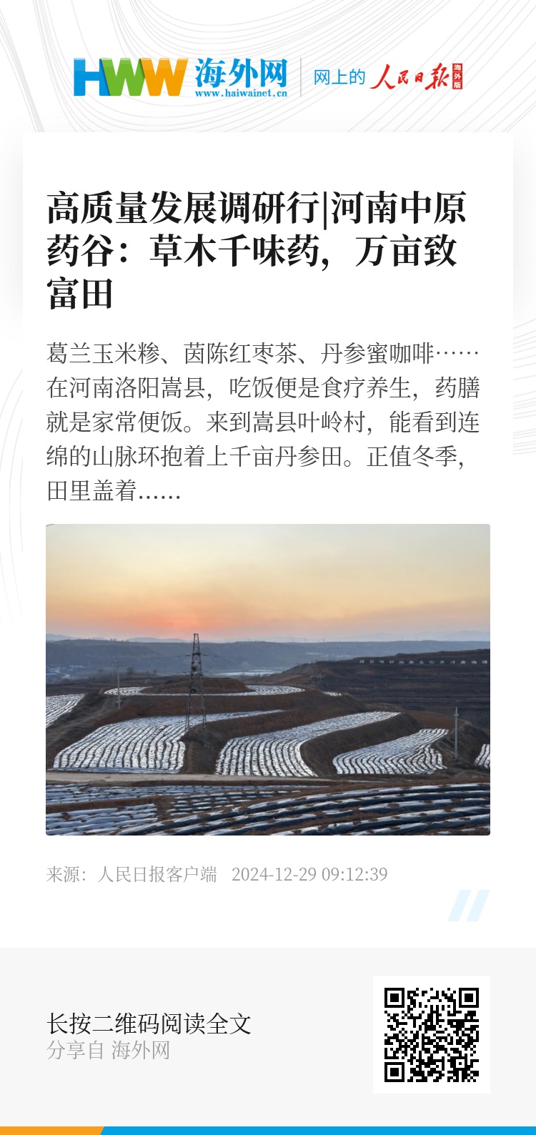 葛兰玉米糁、茵陈红枣茶、丹参蜜咖啡……在河南洛阳嵩县,吃饭便是食疗养生,药膳就是家常便饭。来到嵩县叶岭村,能看到连绵的山脉环抱着上千亩丹参田。正值冬季,田里盖着越冬的薄膜,在阳光照耀下闪闪生辉。这些等待返青的丹参苗,孕育着嵩县兴旺的中医药产业。