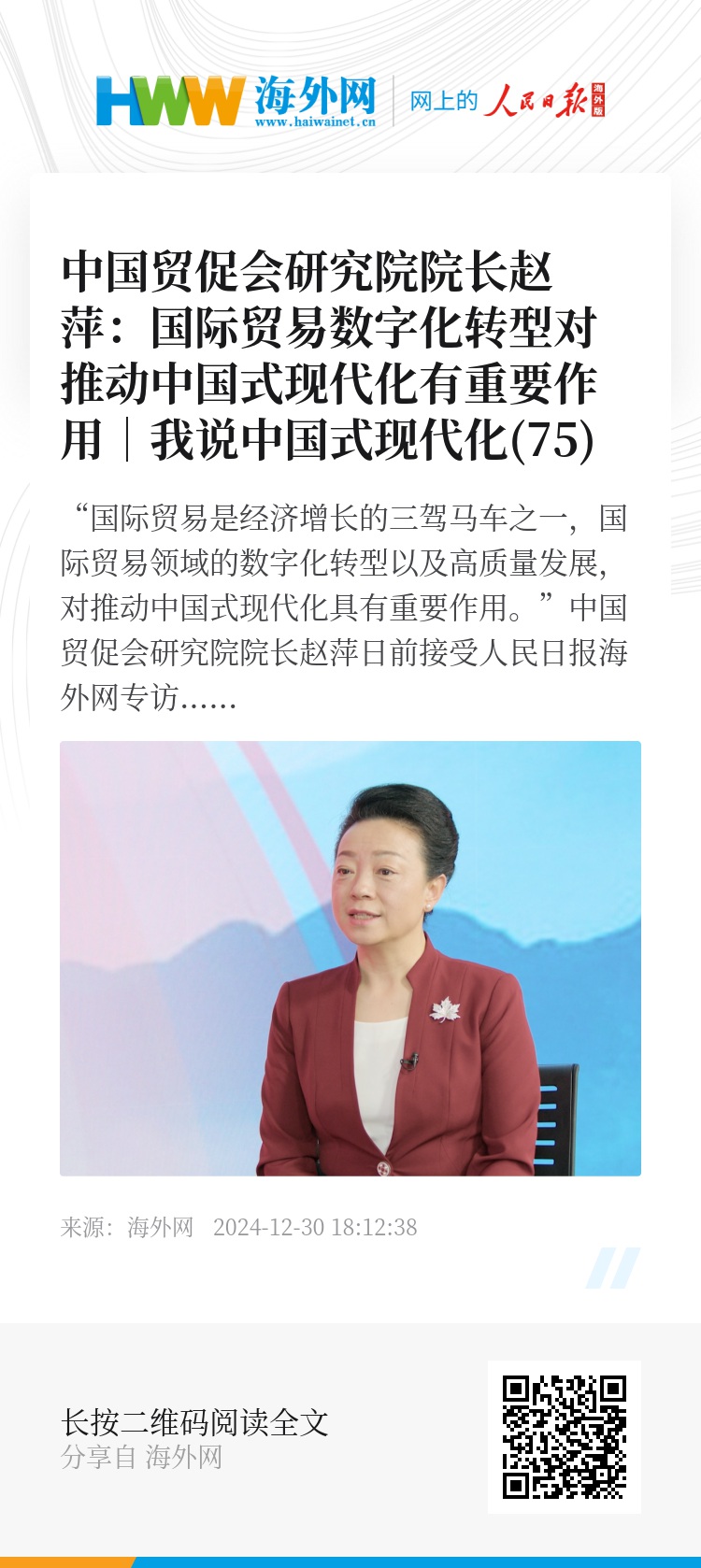 “国际贸易是经济增长的三驾马车之一,国际贸易领域的数字化转型以及高质量发展,对推动中国式现代化具有重要作用。”中国贸促会研究院院长赵萍日前接受人民日报海外网专访时说。