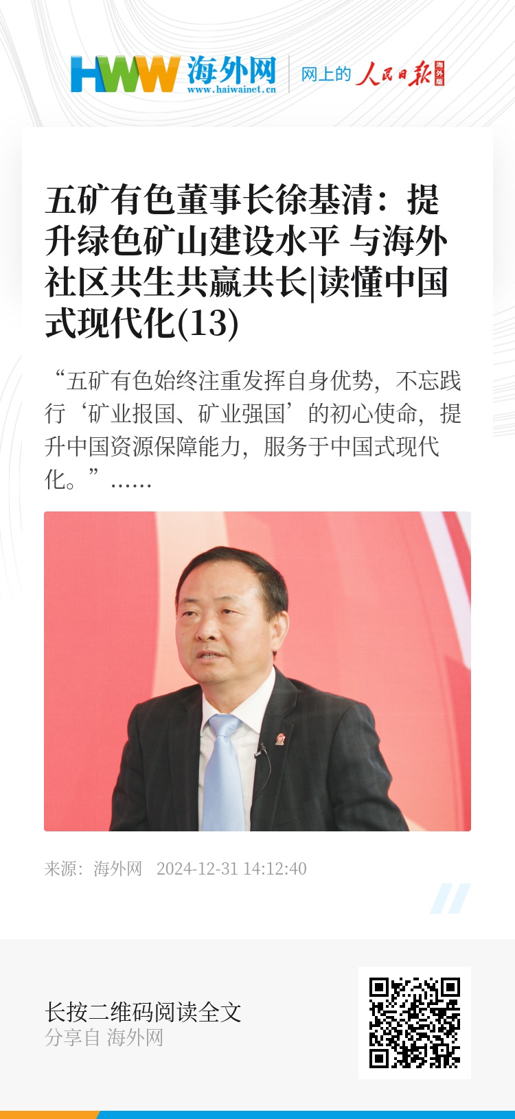 “五矿有色始终注重发挥自身优势,不忘践行‘矿业报国、矿业强国’的初心使命,提升中国资源保障能力,服务于中国式现代化。”五矿有色金属股份有限公司党委书记、董事长徐基清日前接受海外网专访时表示,公司在出海过程中,积极履行社会责任,不断建设绿色矿山、智能矿山,实现在海外与当地社区共生共赢共长。