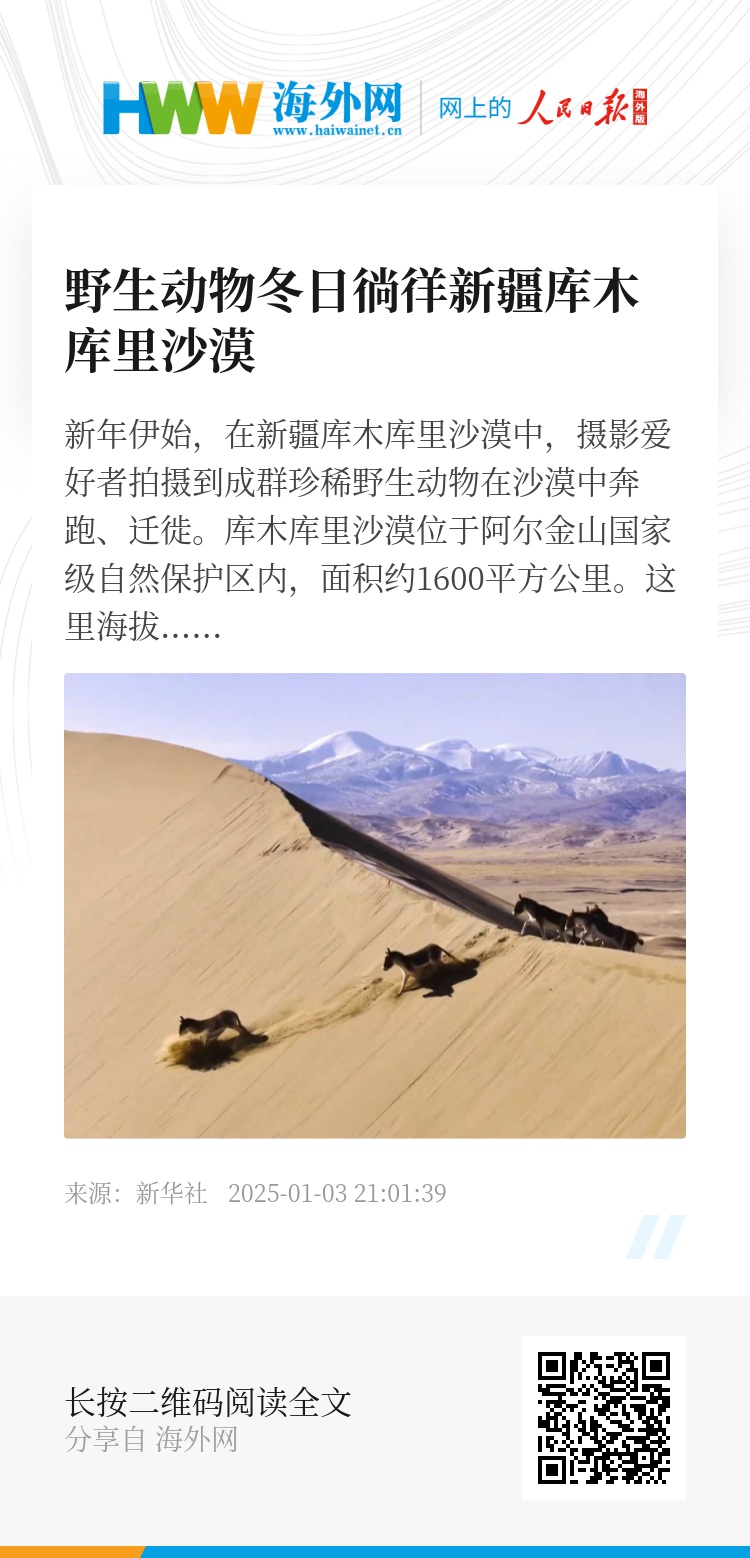 新年伊始,在新疆库木库里沙漠中,摄影爱好者拍摄到成群珍稀野生动物在沙漠中奔跑、迁徙。
