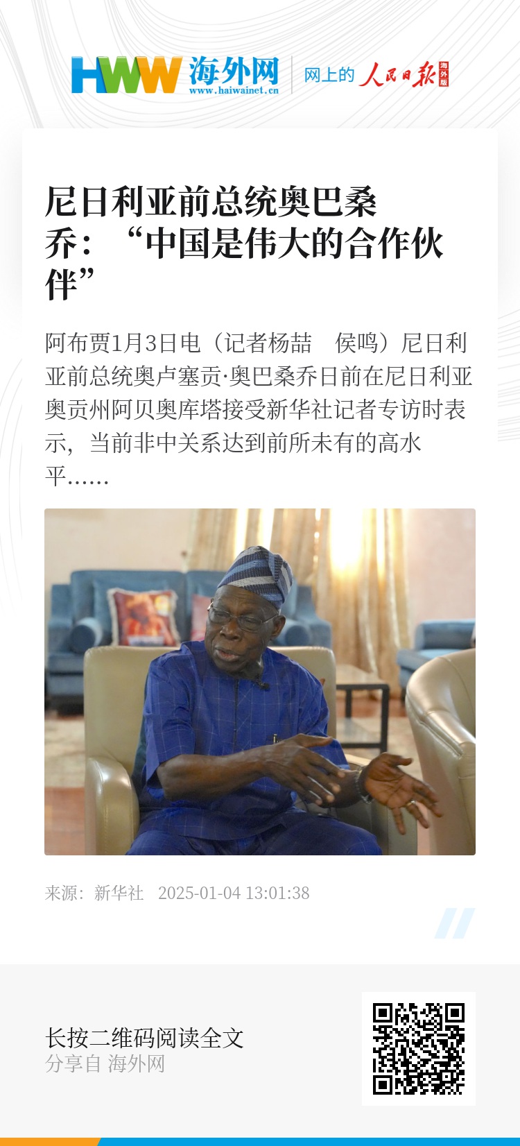 新华社阿布贾1月3日电(记者杨喆 侯鸣)尼日利亚前总统奥卢塞贡·奥巴桑乔日前在尼日利亚奥贡州阿贝奥库塔接受新华社记者专访时表示,当前非中关系达到前所未有的高水平,中国是伟大的合作伙伴,中国的和平发展是尼日利亚、非洲和世界的机遇。