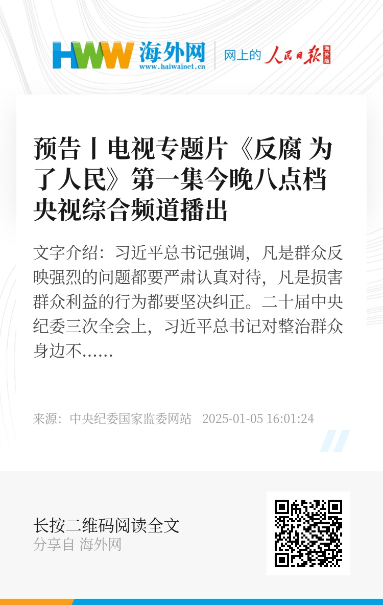 习近平总书记强调,凡是群众反映强烈的问题都要严肃认真对待,凡是损害群众利益的行为都要坚决纠正。二十届中央纪委三次全会上,习近平总书记对整治群众身边不正之风和腐败问题作出重要指示,要求惩治蝇贪蚁腐,让群众有更多获得感。中央纪委国家监委坚决贯彻党中央的决策部署,在全国部署开展群众身边不正之风和腐败问题集中整治。电视专题片《反腐 为了人民》第一集《惩治蝇贪蚁腐》,讲述纪检监察机关聚焦群众反映强烈问题,推动开展校园餐、高标准农田建设、住房保障和安居工程等整治工作,让群众从一个个具体问题的解决中感受到整治成果,不断增强获得感、幸福感、安全感。央视综合频道1月5日晚8点档播出,央视新闻新媒体平台同步播发,敬请关注。