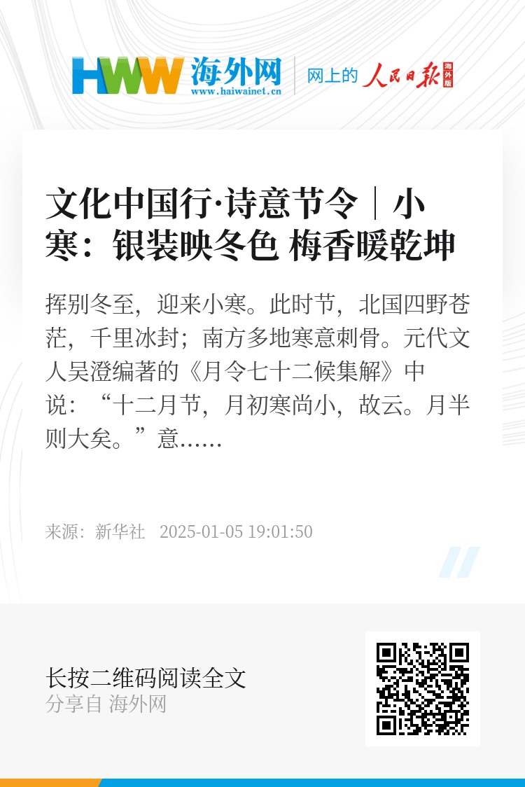 此时节,北国四野苍茫,千里冰封;南方多地寒意刺骨。元代文人吴澄编著的《月令七十二候集解》中说:“十二月节,月初寒尚小,故云。月半则大矣。”意为小寒时节天气寒冷,但未至最寒,到大寒时节,寒冷才会达到极致。