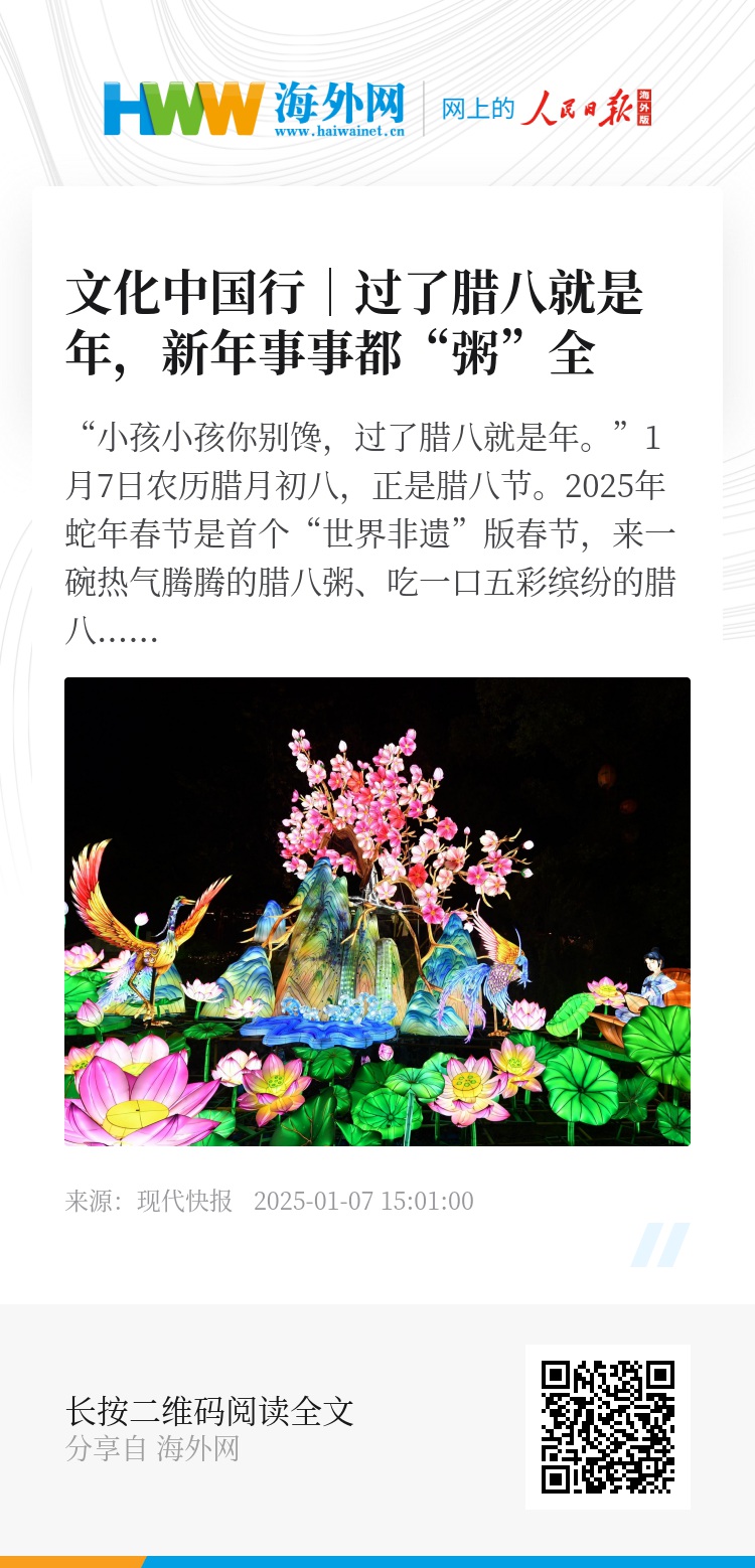 “小孩小孩你别馋,过了腊八就是年。”1月7日农历腊月初八,正是腊八节。2025年蛇年春节是首个“世界非遗”版春节,来一碗热气腾腾的腊八粥、吃一口五彩缤纷的腊八饭、泡一瓶圆圆的腊八蒜……“年”味儿越来越浓。