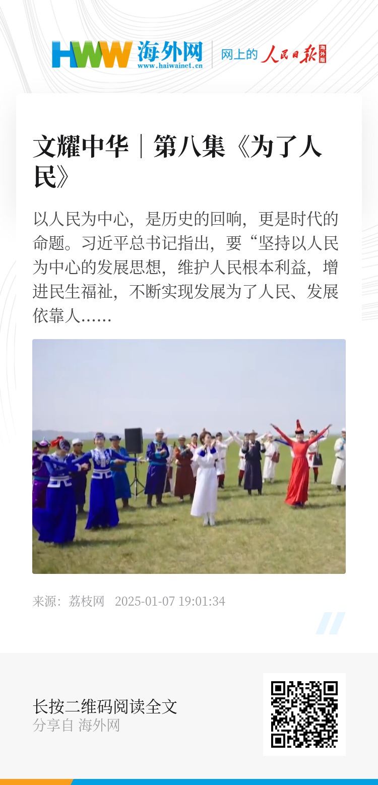 以人民为中心,是历史的回响,更是时代的命题。习近平总书记指出,要“坚持以人民为中心的发展思想,维护人民根本利益,增进民生福祉,不断实现发展为了人民、发展依靠人民、发展成果由人民共享。”1月6日,大型通俗理论节目《文耀中华》播出第八集《为了人民》,讨论如何理解党领导和推动文化建设必须坚持以人民为中心的工作导向,以及如何不断增强人民群众文化获得感和幸福感。