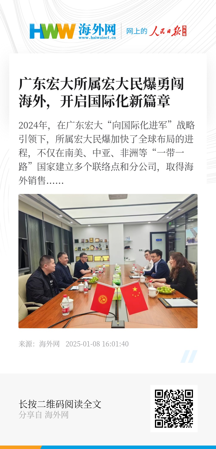 2024年,在广东宏大“向国际化进军”战略引领下,所属宏大民爆加快了全球布局的进程,不仅在南美、中亚、非洲等“一带一路”国家建立多个联络点和分公司,取得海外销售300多万美元的业绩突破,还成功并购秘鲁一家炸药生产企业,并顺利取得ODI(中国境内主体对外投资的一种形式)备案,这不仅是宏大民爆国际化战略的一个里程碑,也是中国民爆企业“走出去”的又一成功案例。
