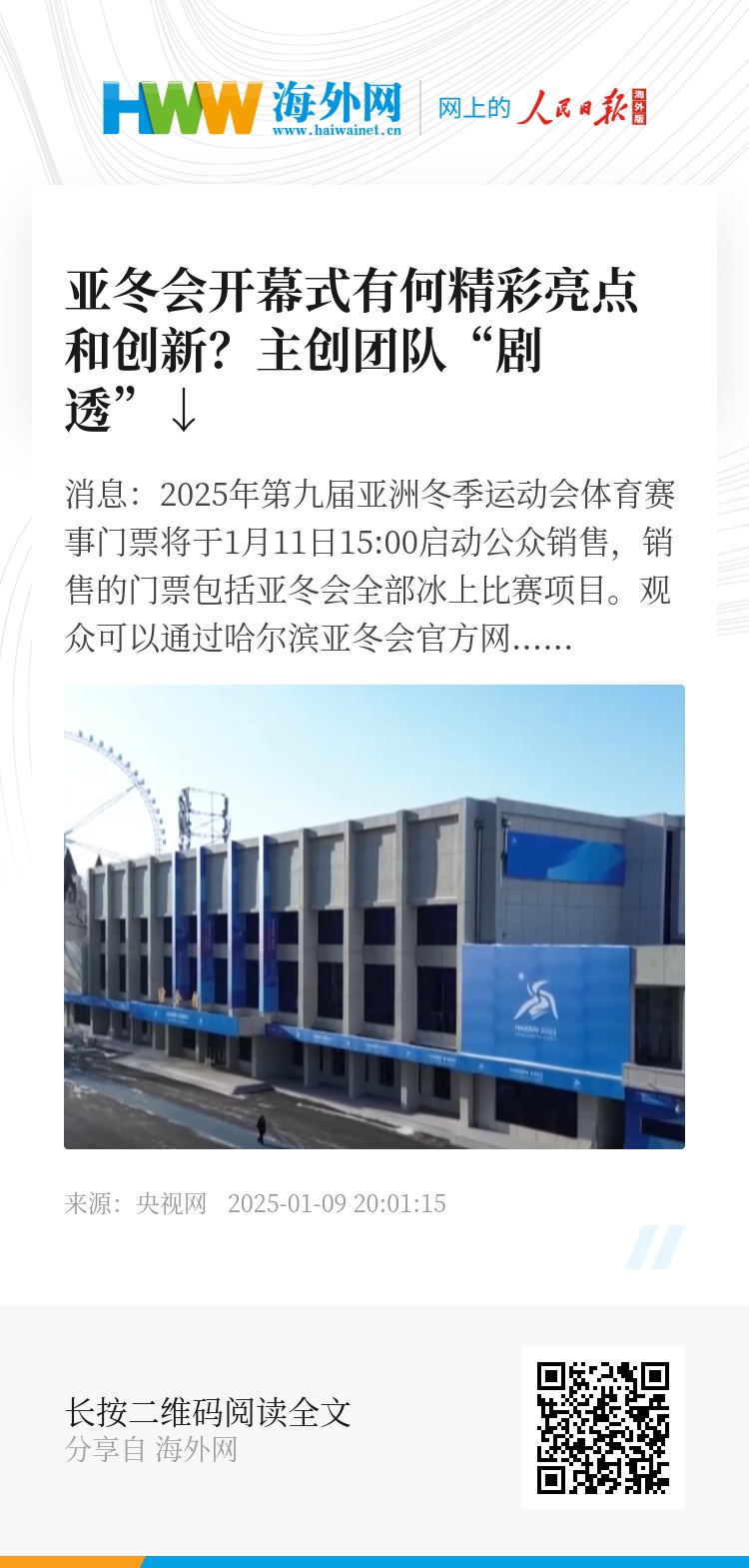 央视网消息:2025年第九届亚洲冬季运动会体育赛事门票将于1月11日15:00启动公众销售,销售的门票包括亚冬会全部冰上比赛项目。观众可以通过哈尔滨亚冬会官方网站或直接登录哈尔滨亚冬会官方票务网站或官方票务小程序购买门票。本届亚冬会将于2月7日在哈尔滨国际会展体育中心举行开幕式,2月14日闭幕。