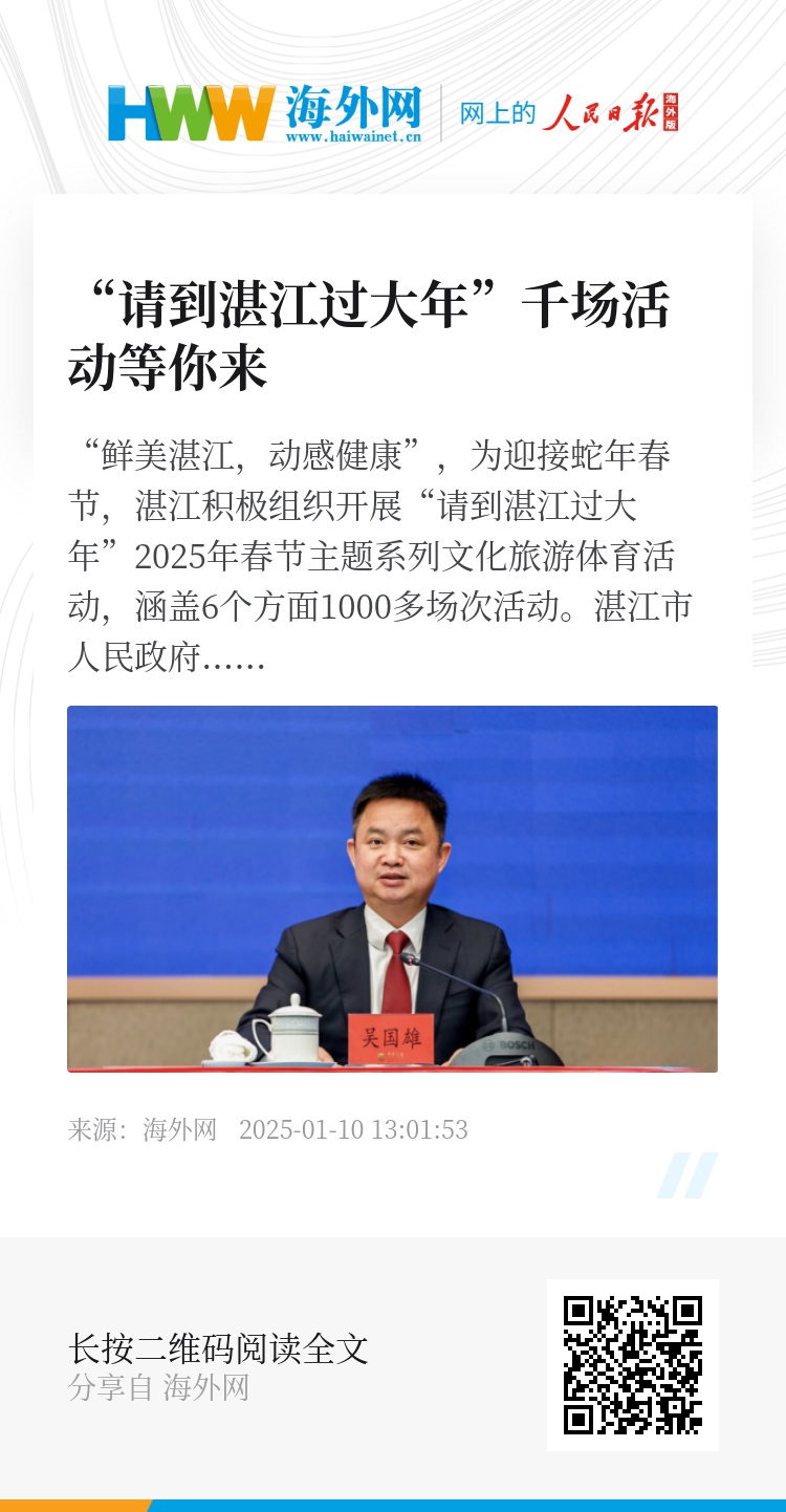 “鲜美湛江,动感健康”,为迎接蛇年春节,湛江积极组织开展“请到湛江过大年”2025年春节主题系列文化旅游体育活动,涵盖6个方面1000多场次活动。湛江市人民政府副市长吴国雄向国内外朋友发出诚挚邀请:“欢迎大家来湛江过大年!”