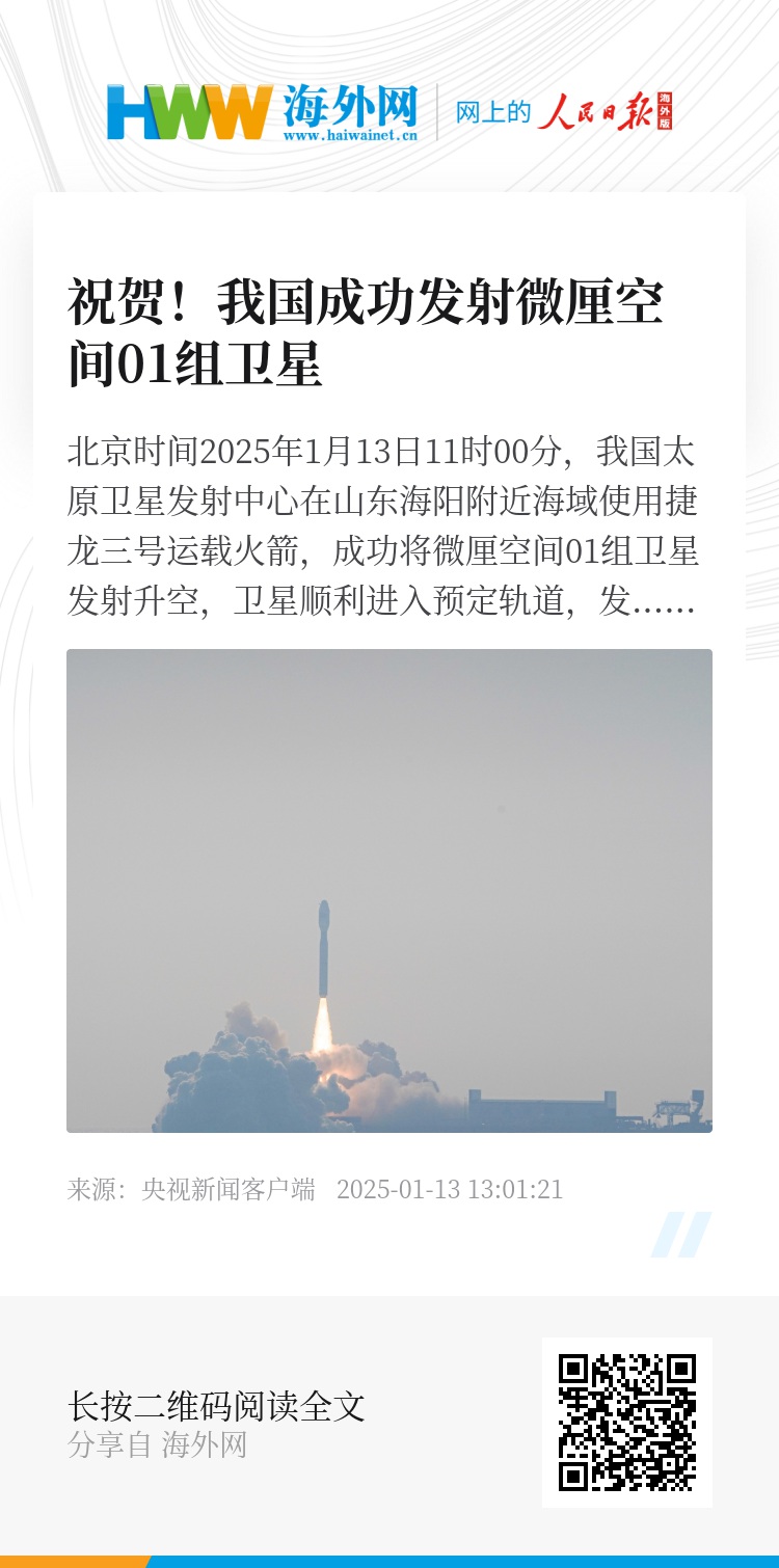 北京时间2025年1月13日11时00分,我国太原卫星发射中心在山东海阳附近海域使用捷龙三号运载火箭,成功将微厘空间01组卫星发射升空,卫星顺利进入预定轨道,发射任务获得圆满成功。