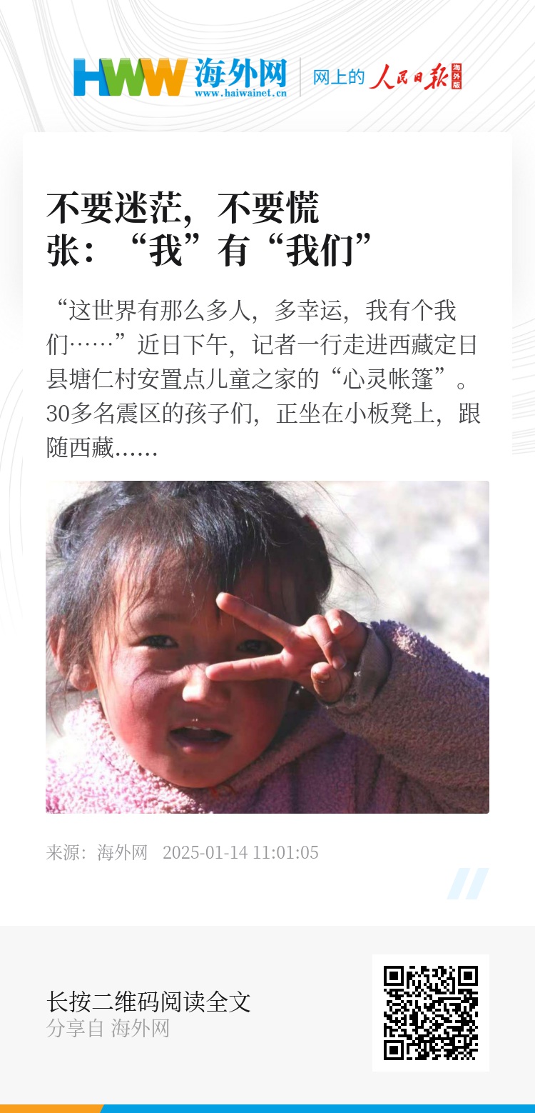 近日下午,记者一行走进西藏定日县塘仁村安置点儿童之家的“心灵帐篷”。30多名震区的孩子们,正坐在小板凳上,跟随西藏星光社会工作服务中心社工次旦拉姆一起轻声哼唱《这世界那么多人》。