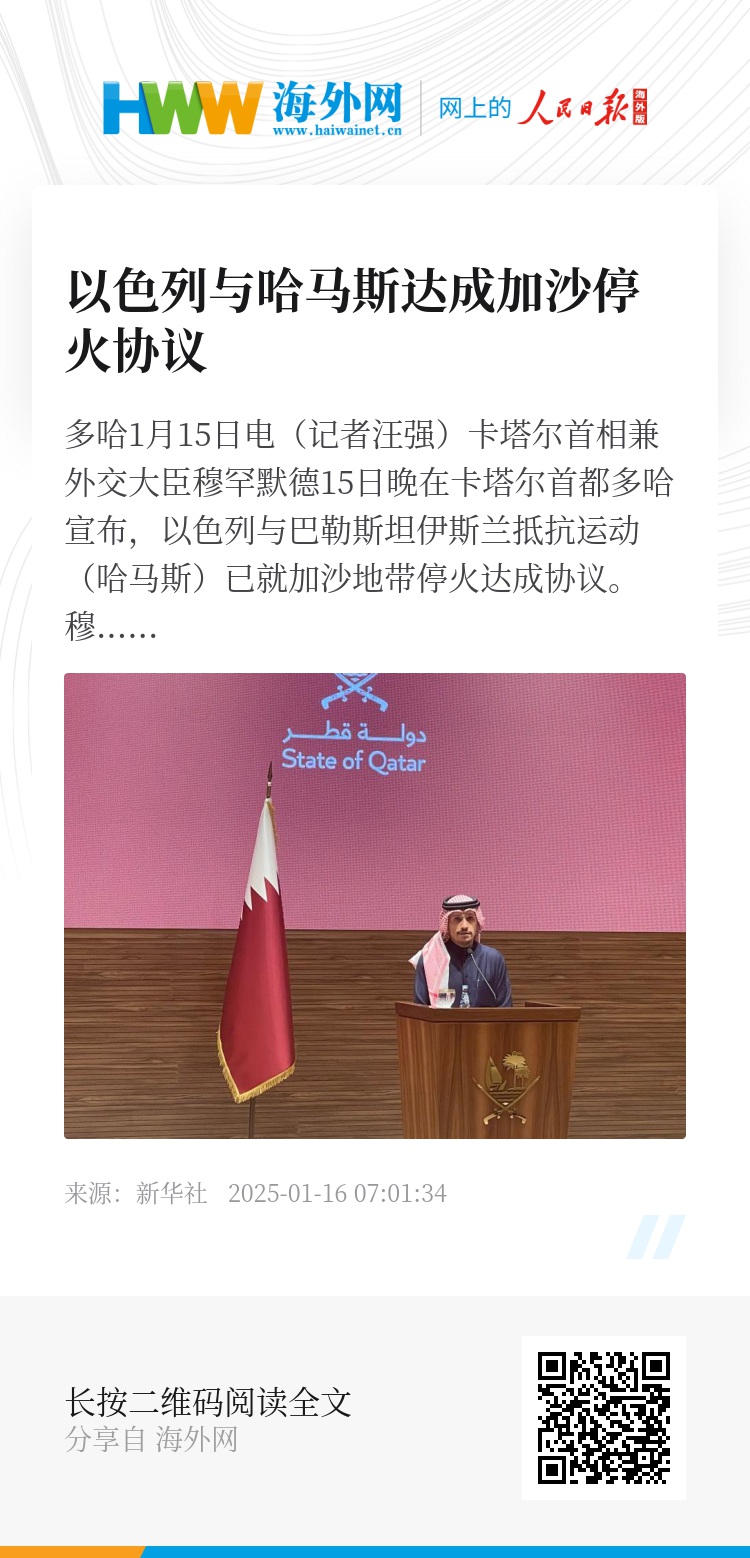 新华社多哈1月15日电(记者汪强)卡塔尔首相兼外交大臣穆罕默德15日晚在卡塔尔首都多哈宣布,以色列与巴勒斯坦伊斯兰抵抗运动(哈马斯)已就加沙地带停火达成协议。