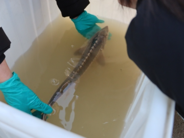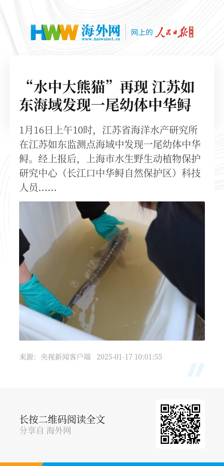 1月16日上午10时,江苏省海洋水产研究所在江苏如东监测点海域中发现一尾幼体中华鲟。经上报后,上海市水生野生动植物保护研究中心(长江口中华鲟自然保护区)科技人员赶赴如东进行救助。