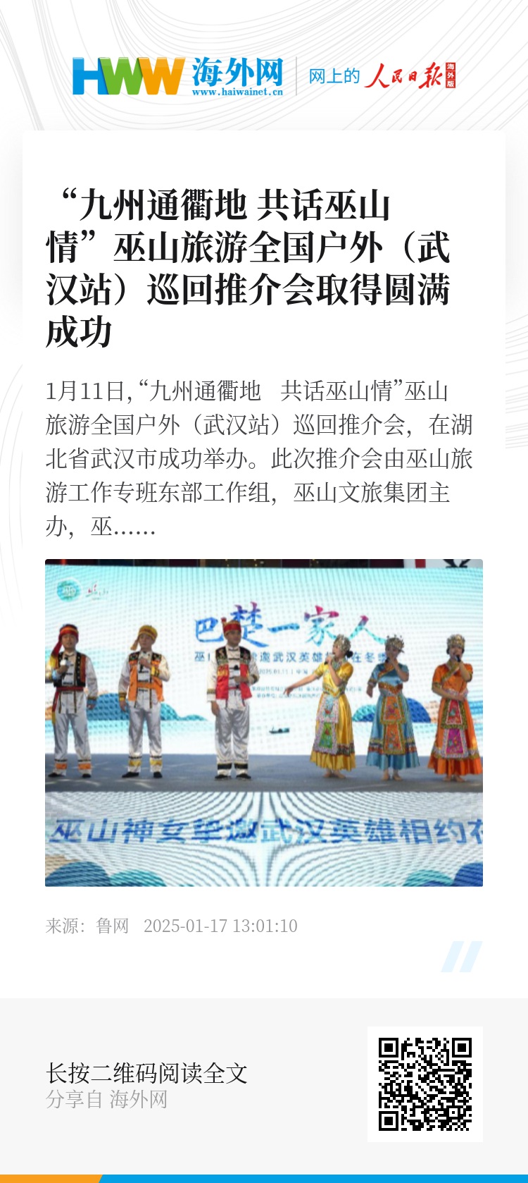 1月11日,“九州通衢地 共话巫山情”巫山旅游全国户外(武汉站)巡回推介会,在湖北省武汉市成功举办。
