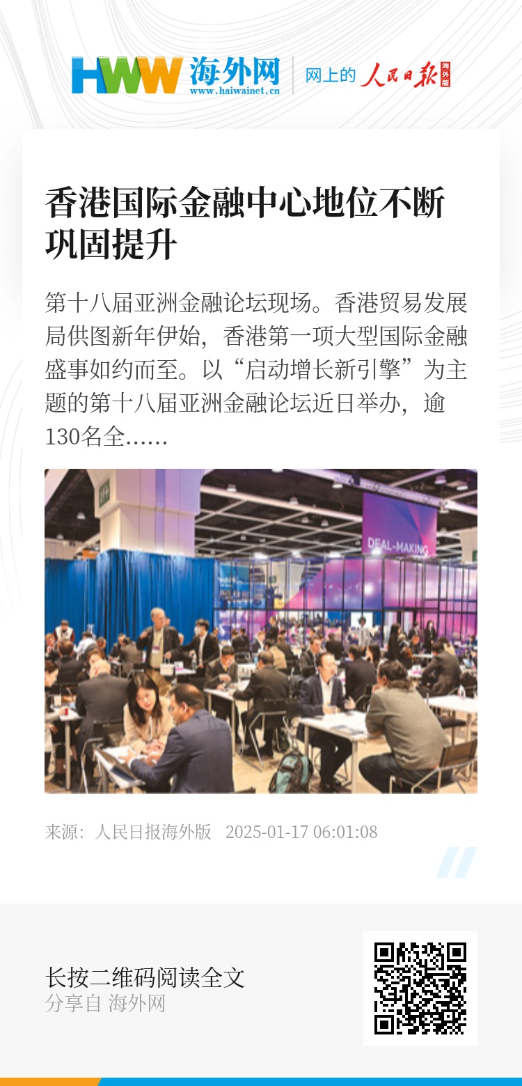 “香港在最近公布的《全球金融中心指数》排名亚洲第一、全球第三。在《2024年世界竞争力年报》中,香港排名全球第五,比之前一年跃升两位,在国际贸易和商业法规方面更排名全球第一。”李家超表示,香港国际金融中心地位稳固,接下来将专注提升现有优势,巩固香港作为国际资产管理中心和财富管理中心的竞争力。
