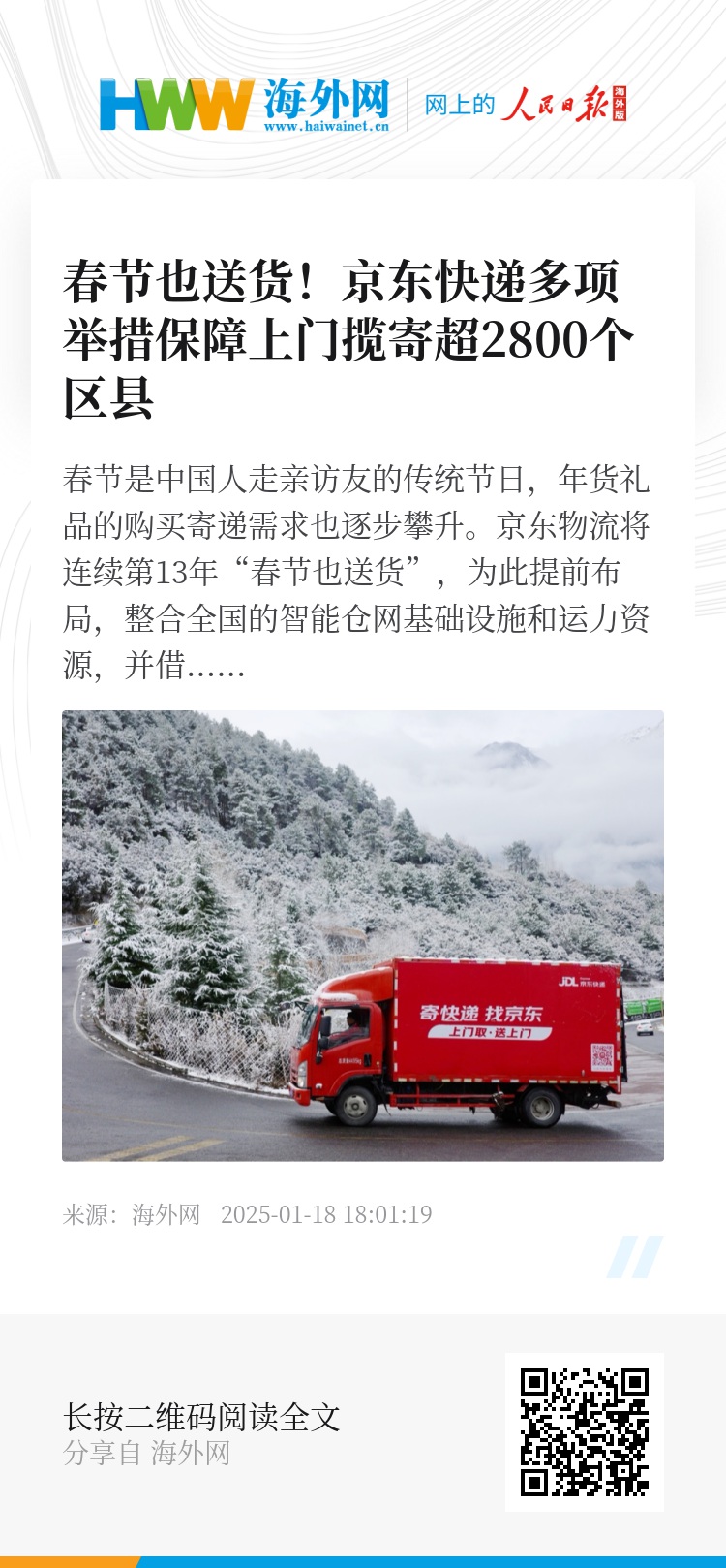 春节也送货,年货与新春祝福齐上门。京东快递通过全面升级的服务举措,提供更加省心、便捷的年货寄递服务,让亿万消费者都能在传统佳节中感受到浓浓的年味与温暖。