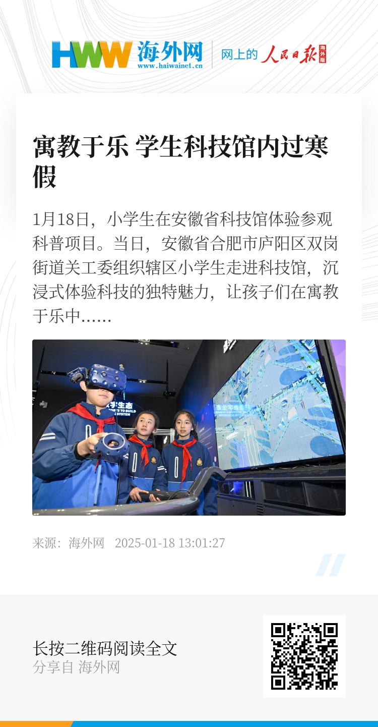 1月18日,小学生在安徽省科技馆体验参观科普项目。当日,安徽省合肥市庐阳区双岗街道关工委组织辖区小学生走进科技馆,沉浸式体验科技的独特魅力,让孩子们在寓教于乐中度过一个科技范儿十足的寒假生活。图片来源:赵明/视觉中国