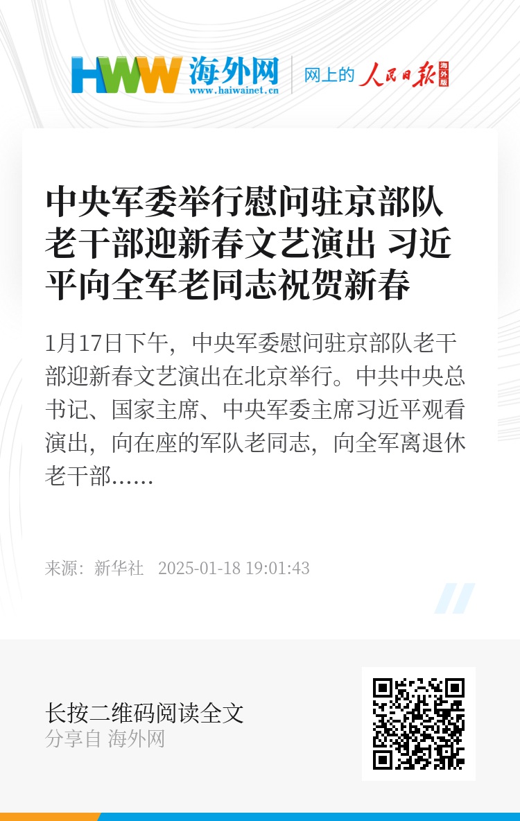 新华社北京1月18日电(记者梅常伟)在中华民族传统节日春节即将到来之际,中央军委17日在京举行慰问驻京部队老干部迎新春文艺演出。中共中央总书记、国家主席、中央军委主席习近平观看演出,向在座的军队老同志,向全军离退休老干部,致以节日问候和新春祝福。