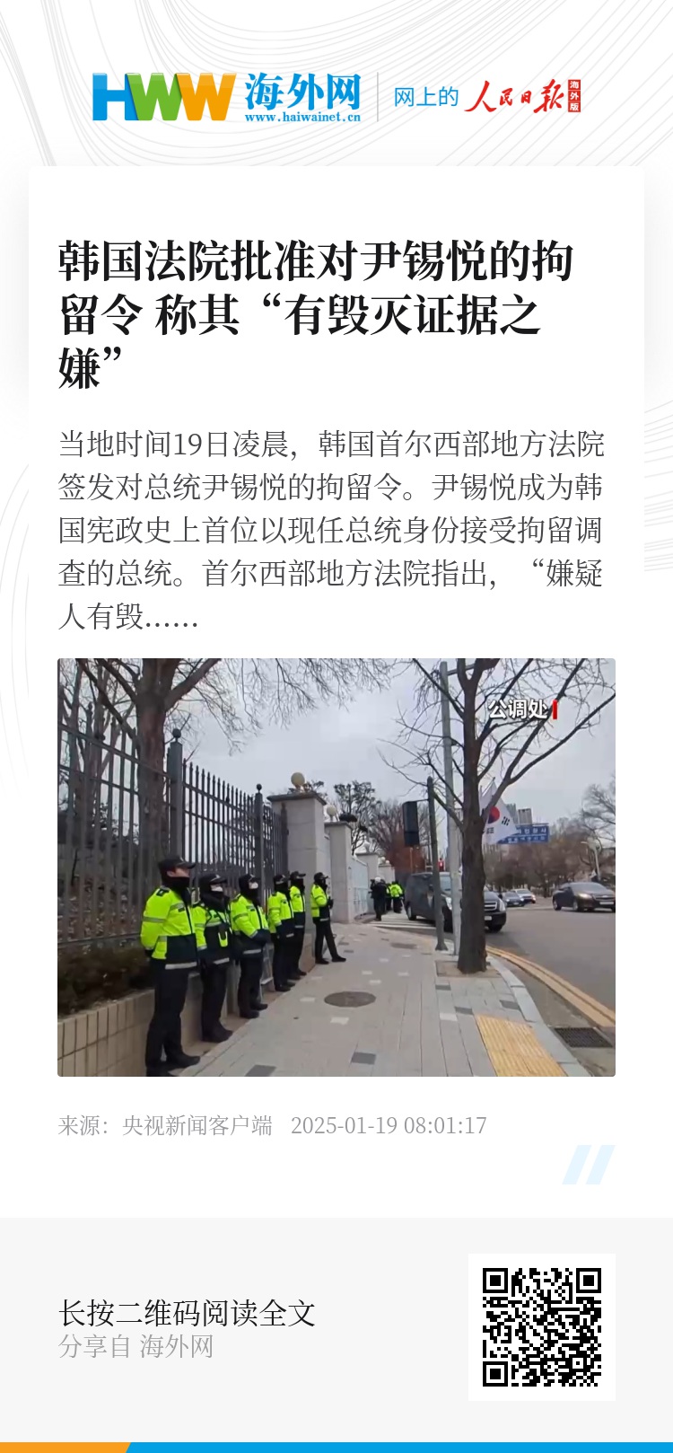 当地时间19日凌晨,韩国首尔西部地方法院签发对总统尹锡悦的拘留令。尹锡悦成为韩国宪政史上首位以现任总统身份接受拘留调查的总统。首尔西部地方法院指出,“嫌疑人有毁灭证据之嫌”,因此签发对他的拘留令。对他的羁押最长可达20天。